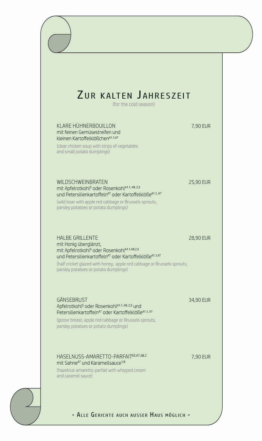 H a u p t a l l e r g e n e: A1 Glutenhaltiges Getreide, namentlich A1.1 Weizen, A1.2 Roggen, A1.3 Gerste, A1.4 Hafer, A1.5 Dinkel, A1.6 Kamut oder Hybridstämme davon sowie daraus hergestellte Erzeugnisse, A2 Krebstiere und daraus gewonnene Erzeugnisse, A3 Ei und daraus gewonnene Erzeugnisse, A4 Fisch und daraus gewonnene Erzeugnisse, A5 Erdnüsse und daraus gewonnene Erzeugnisse, A6 Sojabohnen und daraus gewonnene Erzeugnisse, A7 Milch und daraus gewonnene Erzeugnisse (einschließl. Laktose), A8 Schalenfrüchte, namentlich A8.1 Mandeln, A8.2 Haselnüsse, A8.3 Walnüsse, A8.4 Kaschunüsse, A8.5 Pecannüsse, A8.6 Paranüsse, A8.7 Pistazien, A8.8 Macadamia- oder Queenslandnüsse sowie daraus gewonnene Erzeugnisse, A9 Sellerie und daraus gewonnene Erzeugnisse, A10 Senf und daraus gewonnene Erzeugnisse, A11 Sesam und daraus gewonnene Erzeugnisse, A12 Schwefeldioxid und Sulfite, 3 Lupinen und daraus gewonnene Erzeugnisse, A14 Weichtiere und daraus gewonnene Erzeugnisse Z u s a t z s t o f f e: 1 mit Farbstoff, 2 mit Konservierungsstoff, 3 mit Antioxydationsmittel, 4 mit Geschmacksverstärker, 5 geschwefelt > 10 mg/kg oder 10mg/l 6 geschwärzt, 7 gewachst, 8 mit Phosphat, 9 mit Süßungsmittel, B1 Koffein, B2 Chinin, Chininsalze, B3 Taurin